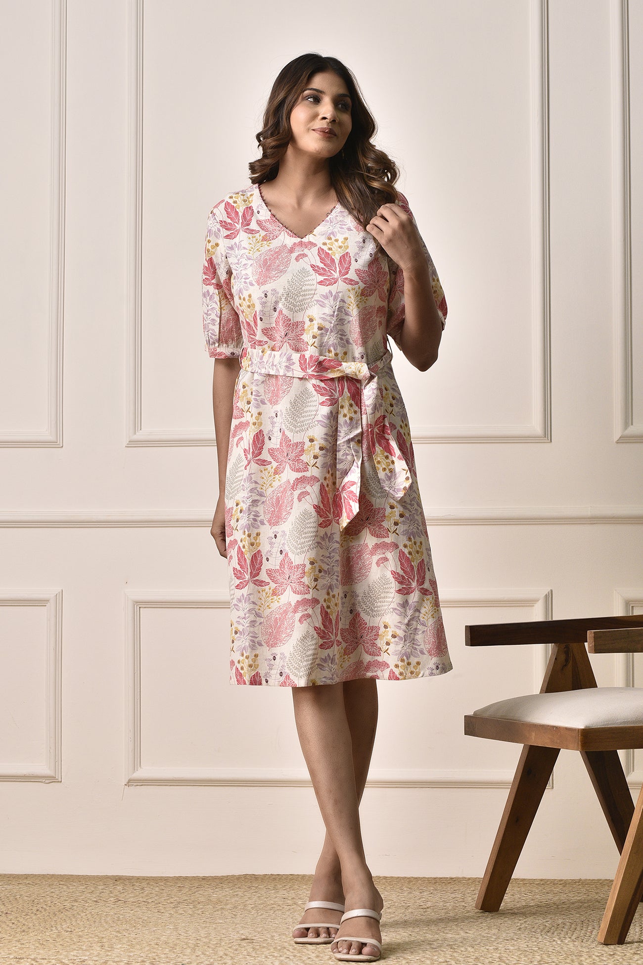 Knee length A-line dress in Printed Linen-cotton fabric. Features 3/4 sleeves with a V- neck